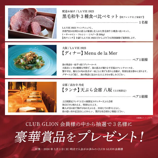 3月1日までにCLUB GLIONへ入会いただいた方の中から抽選で豪華プレゼントが当たります!