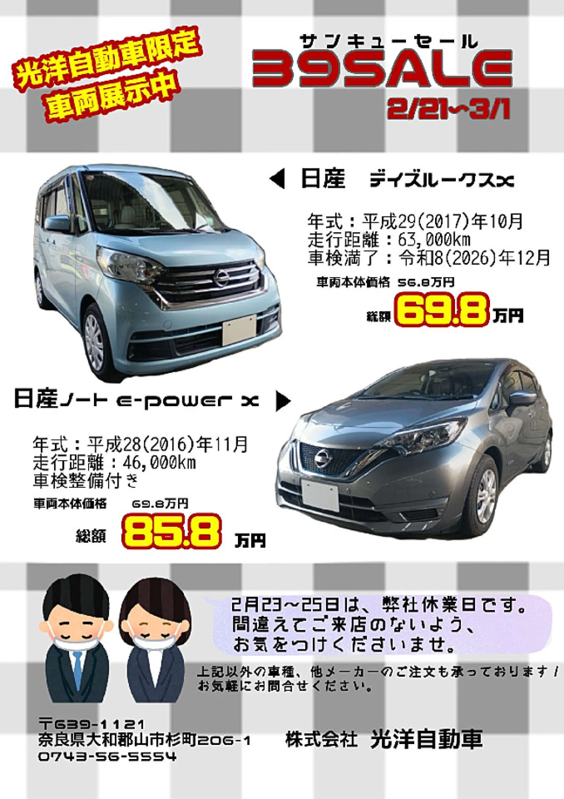 光洋自動車では2月21日(土)~3月1日(日)まで、39(サンキュー)フェアを開催中です!